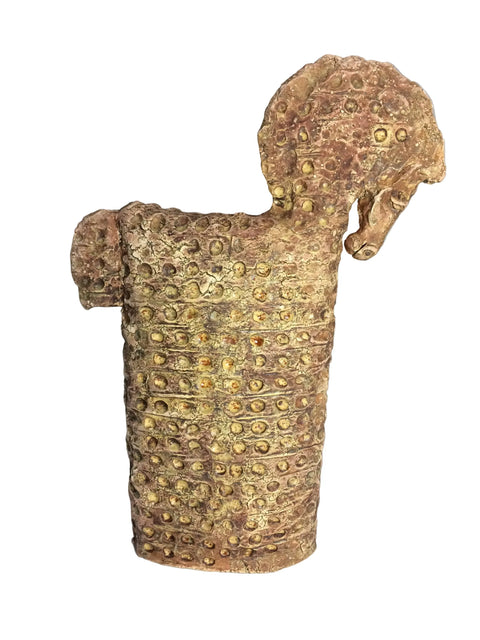 En smuk hest i brune og okker jord toner, som med sine detaljer, ligner at den er nittet sammen af plader i metal. Skulpturen er 100% håndlavet og derfor kan to aldrig blive ens.